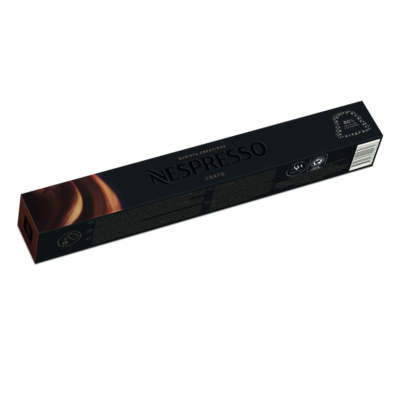 10 BARISTA Corto capsules of roast and ground coffee for the Nespresso system.