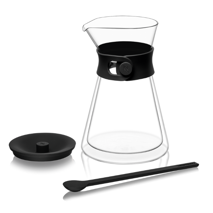 The Vertuo Carafe Set is specially designed to reveal the full potential of the Carafe Pour-Over Style coffee, by maintaining the coffee's optimal flavour profile and temperature. Just what you need for some quality time with your favourite people. Its double-walled glass design keeps the drink hot, or cold. Leaving it up to you to take your time, while you take your coffee. Designed by Konstantin Grcic, the carafe is a pleasure to look at, and a pleasure to pour. For a coffee moment that flows. Comes with a matte silicone spoon to help evenly distribute the entire bouquet of aromas around the carafe before you pour.