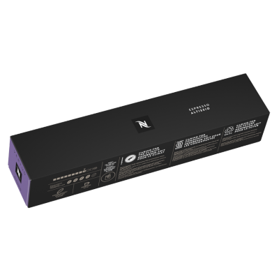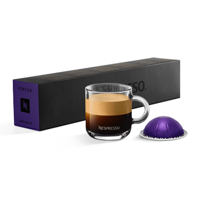 When Altissio walks in, you’ll notice. The South American Arabicas and a touch of Brazilian Robusta give it that full - bodied, bold espresso taste. We balanced these coffees out with a Costa Rican Arabica that adds its soft cereal note. These Arabica and Robusta coffees get an intense and short roast to bring out that full - bodied character. In royal robes, Altissio is a Vertuo espresso coffee cloaked in a thick, velvety crema - full of roasty notes and a soft and creamy cereal note