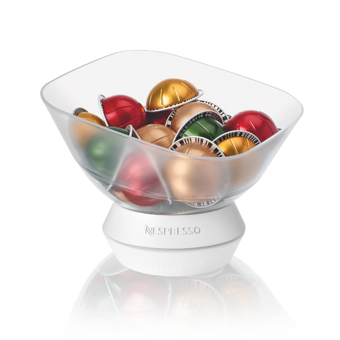 Läbipaistev kapslihoidik, kuhu mahub 60 originaalkapslit. Materjal: kauss – polümetüülmetakrülaat, alus – metüülmetakrülaat.